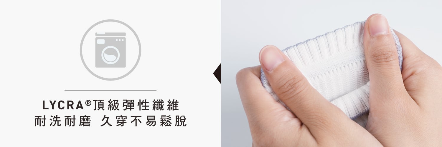 採用LYCRA®頂級彈性纖維,襪口彈性回復率達100%,耐洗耐磨,不易鬆弛滑脫,伸縮效果更佳且不易變形。